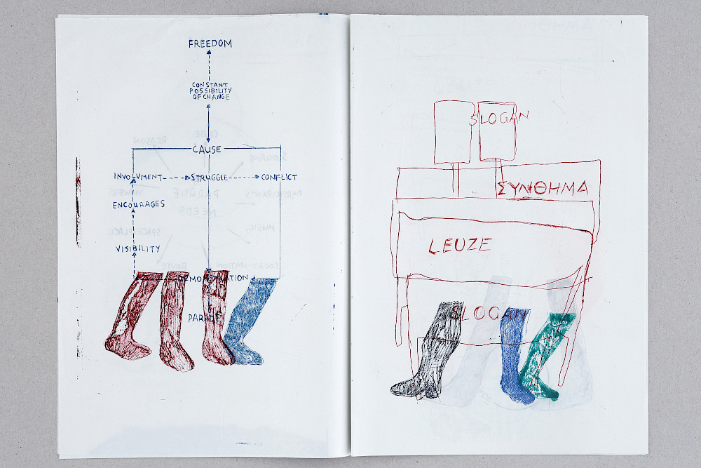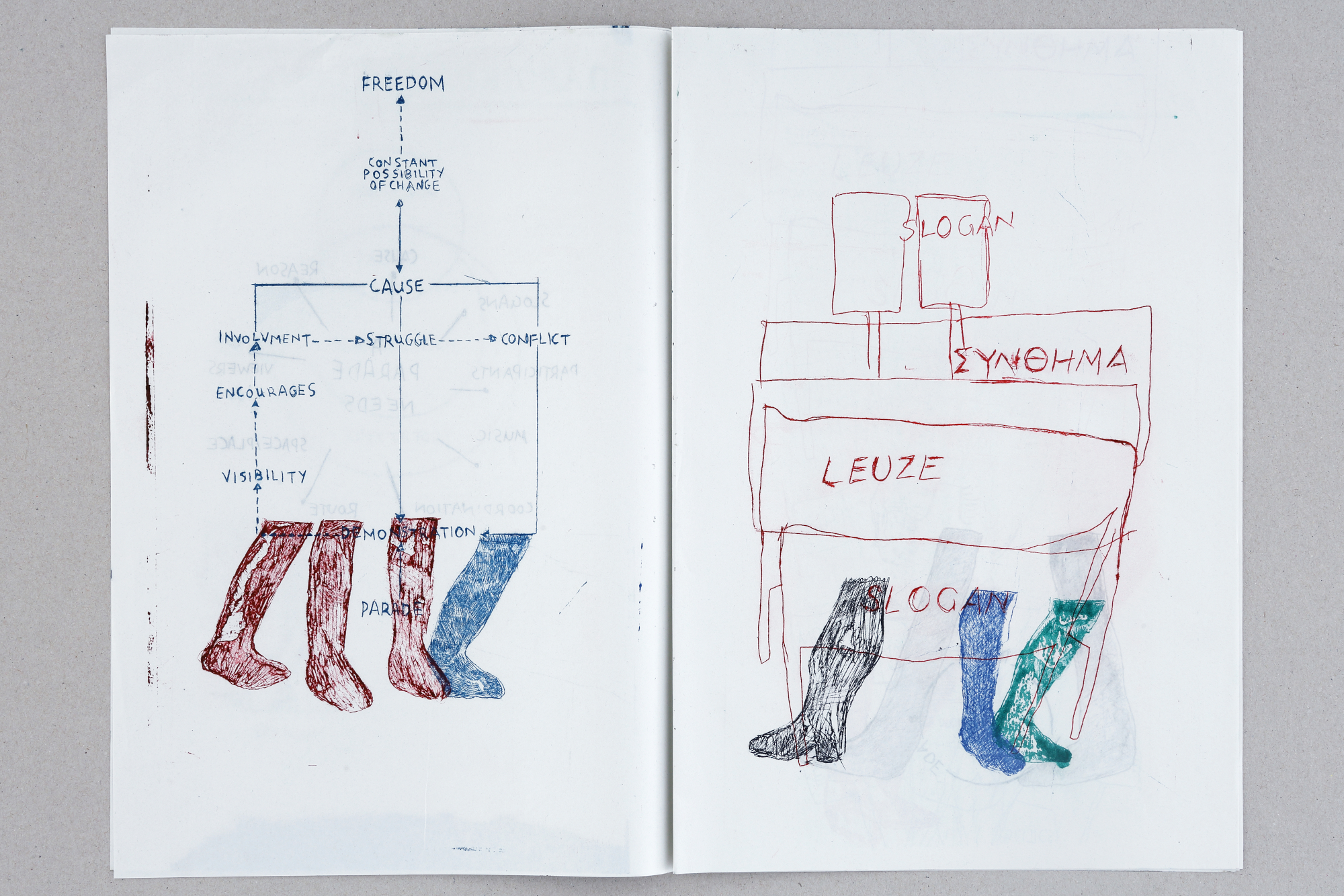Eleni Kamma’s research project, initiated with the support of A/R, involves a historical re-reading and analysis of the issues at stake in caricature from the standpoint of current politics and contemporary art. Parallel to her research, the artist is writing a thesis entitled Taking Place: Parrhesiastic theatre as a model for artistic practice. Parrhesia, from the ancient Greek παρρησία (“speak freely”), can be interpreted to mean free speech, as in the liberty of expression, or even the obligation to speak truths for the common good at the risk of personally exposing oneself to the public. The artist uses this concept as a way to question the notion of entertainment in relation to personal expression, within the context of an artistic practice that draws on public participation.