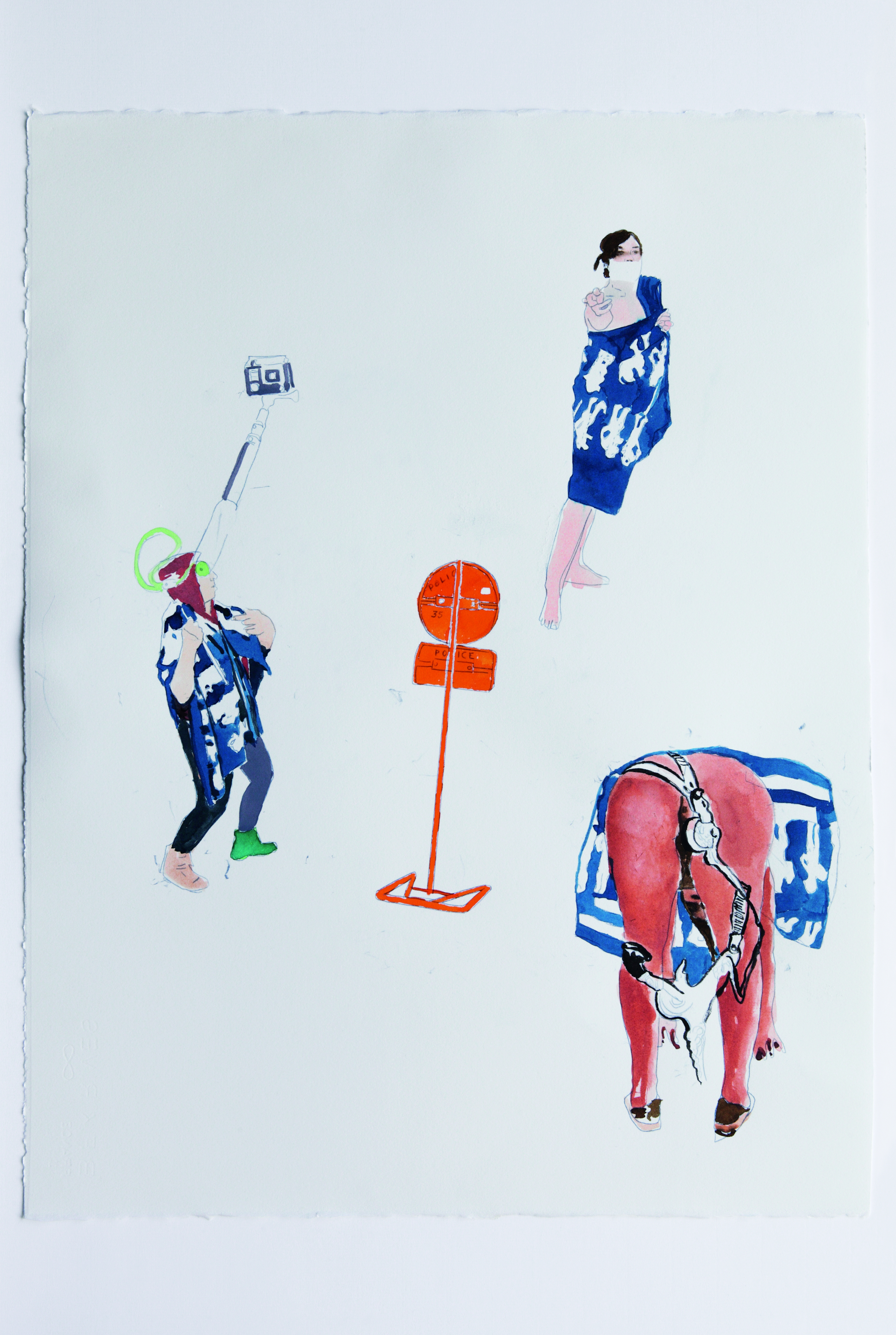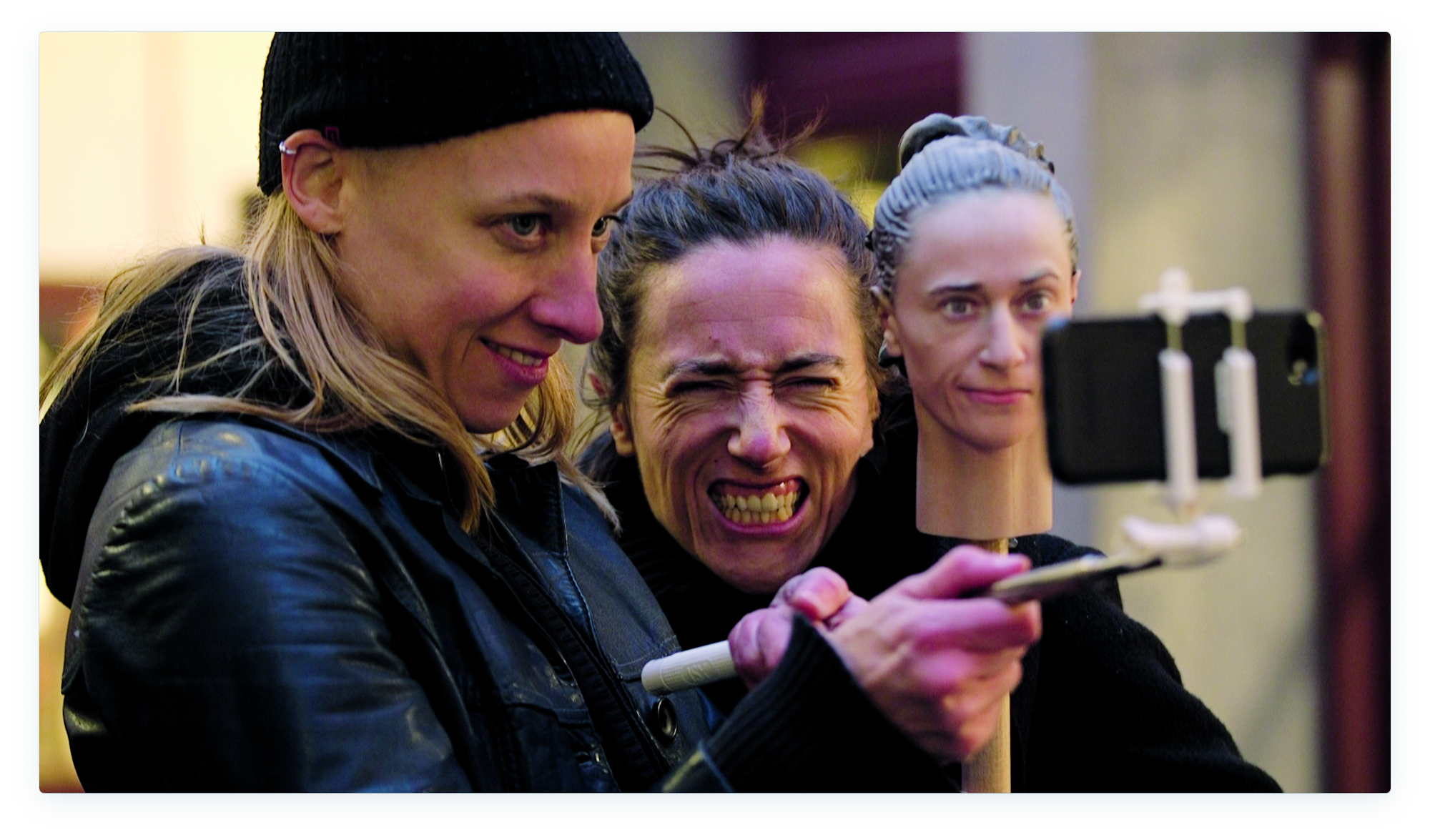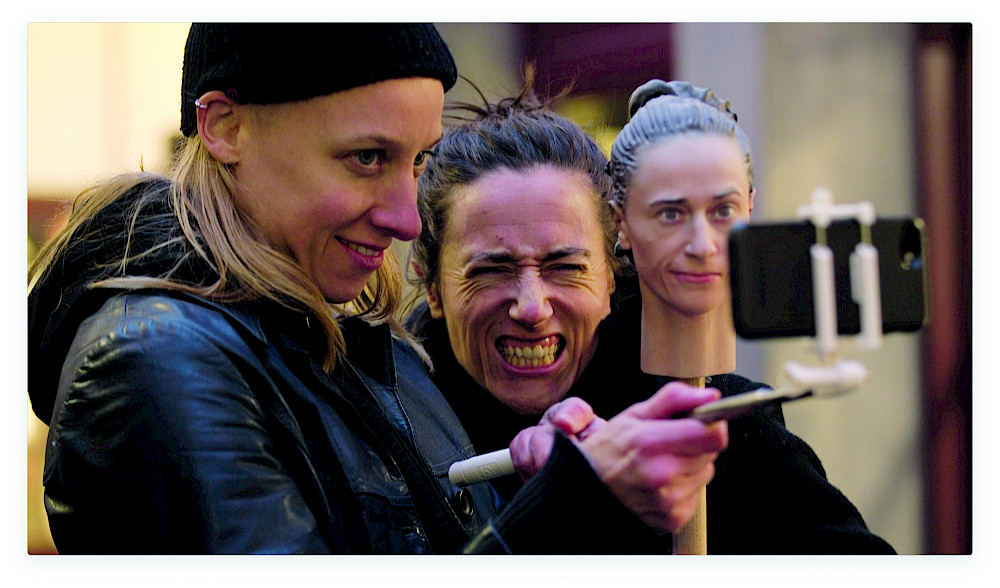 - Arrêts sur images de vidéos tournées pendant la recherche A/R d'Eleni Kamma, 2017.Image extraite d'une vidéo sur l'interaction entre le Fou et le Selfie-Junkie.Caméra : Boris Van Hoof.Performers : Sahra Huby, Jessica Van Rüschen.