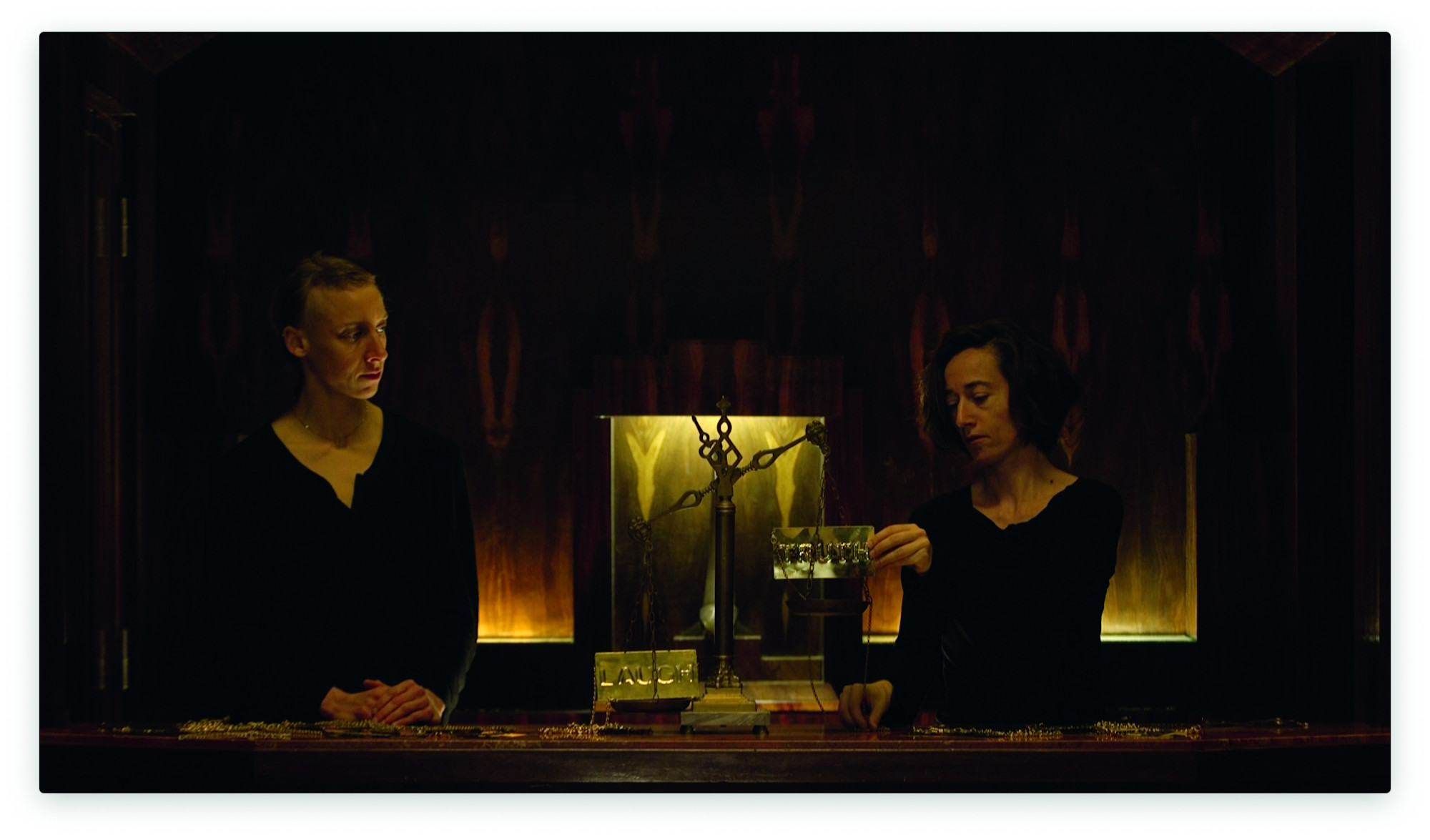 - Arrêts sur images de vidéos tournées pendant la recherche A/R d'Eleni Kamma, 2017. Image extraite d'une vidéo qui explore le personnage du Glossaire des mots parrhèsiastiques. Caméra : Boris Van Hoof.Performers : Sahra Huby, Jessica Van Rüschen.