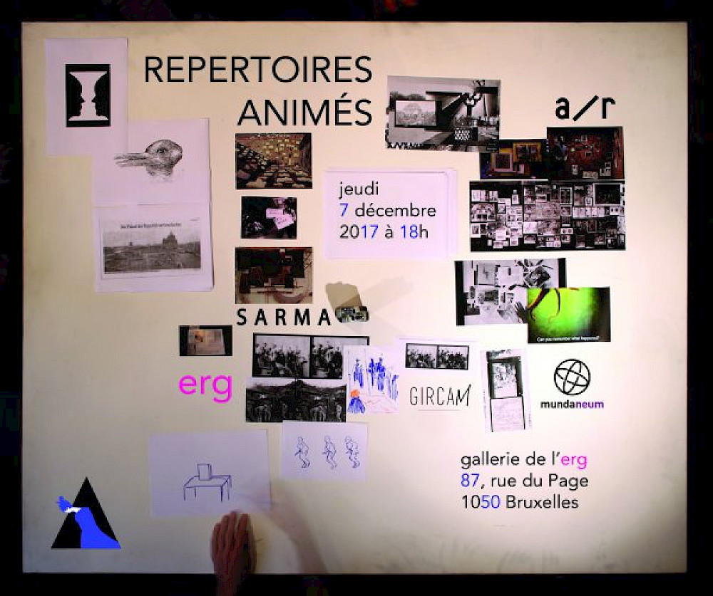 Le projet « Répertoires Animés » est porté par Alexander Schellow, réalisateur de films d’animation basés sur la reconstruction du processus mnémonique, à la jonction entre pratique artistique et recherche scientifique, ainsi que le groupe de recherche ARG (Animation Research Group), constitué d’étudiants, doctorant et professeur issus de l’erg (école de recherche graphique) à Bruxelles. Ce collectif rassemblé autour de la notion d’« expanded animation », comprise comme un ensemble de pratiques artistiques hétérogènes, œuvre à la redéfinition constante de ce médium. Récemment, le groupe a orienté ses recherches sur le document et cherche à mettre en place des dispositifs créatifs qui permettent de révéler le potentiel inhérent d’une archive une fois activée par ses utilisateurs. L’animation est donc considérée au sein de cette recherche non seulement en tant que mode de perception et de construction de l’image, mais également comme méthodologie. Ce déplacement met ainsi à jour des tensions potentielles de manière productive.