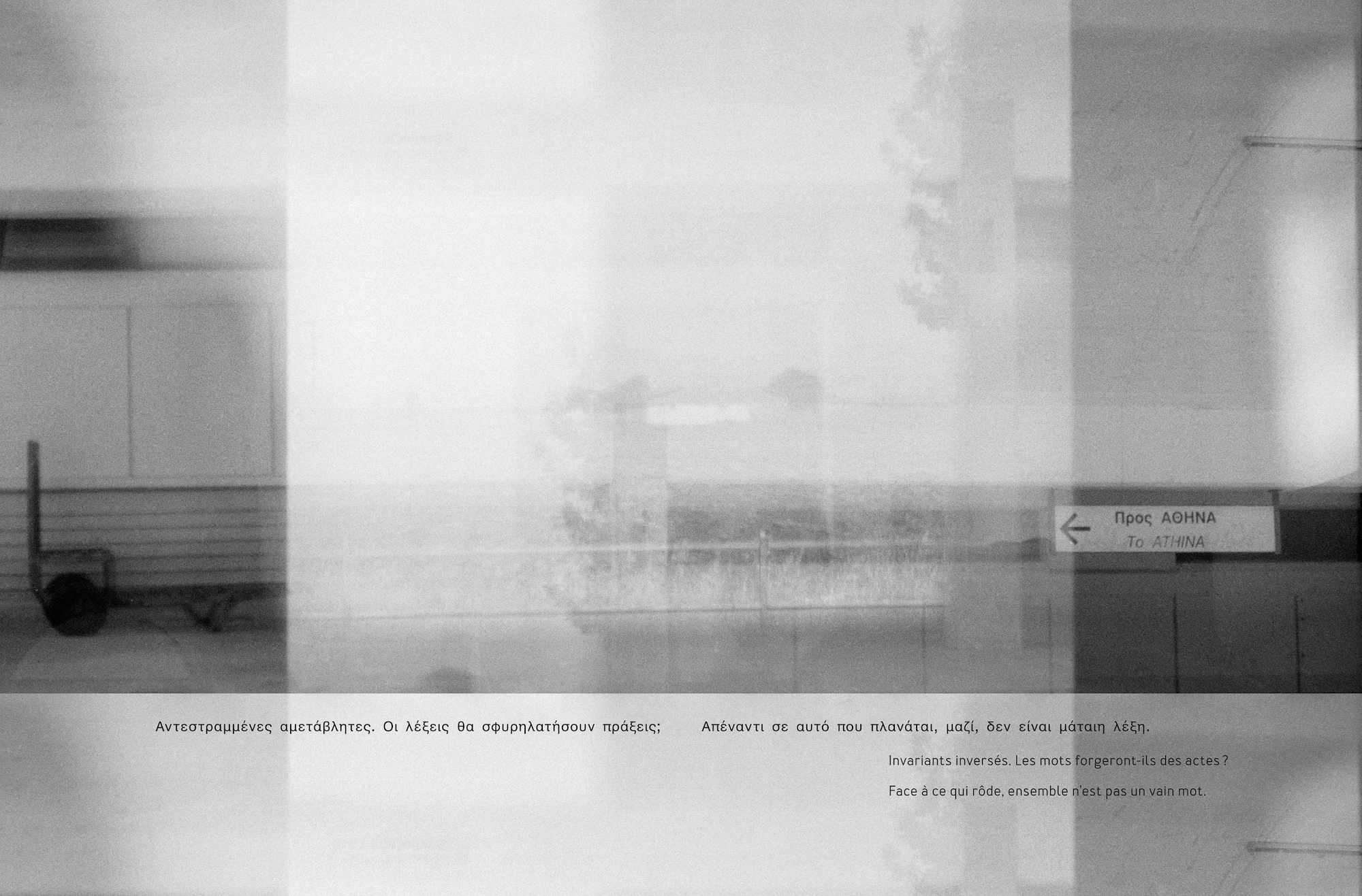 Aside from the performances and field studies, the research also led to an exhibition of images and words at the Institut français in Athens, a hybrid presentation at the Royal Academy of Fine Arts of Brussels, and the risographic publication afto, created in