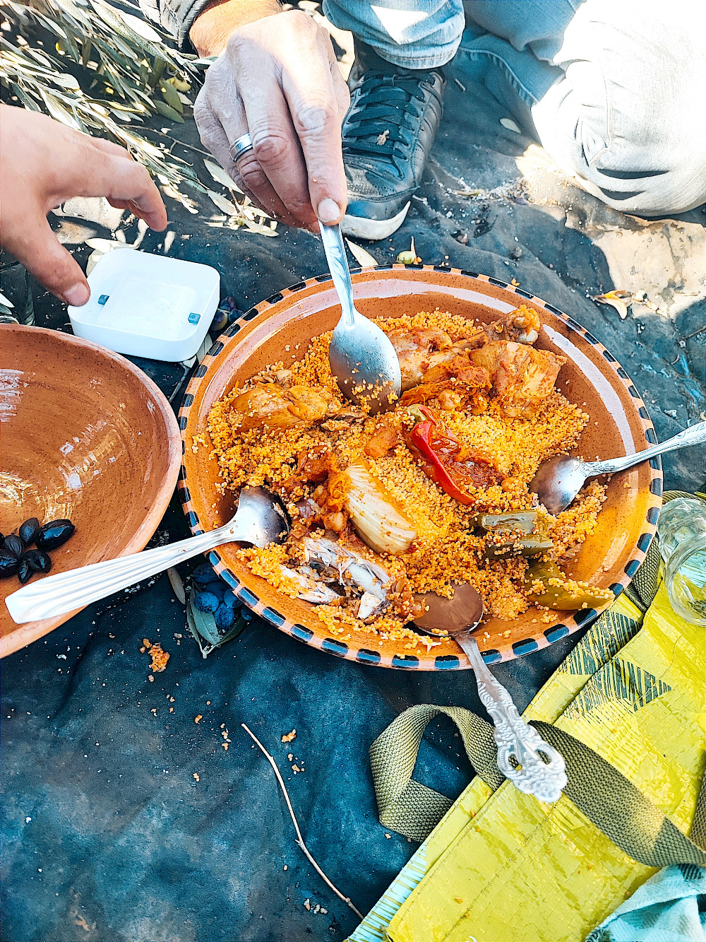 - Olive harvest meal in Henchir Lksour, my grandfather's homeland in northern Tunisia, October 2023; photo credit: Ichraf Nasri
