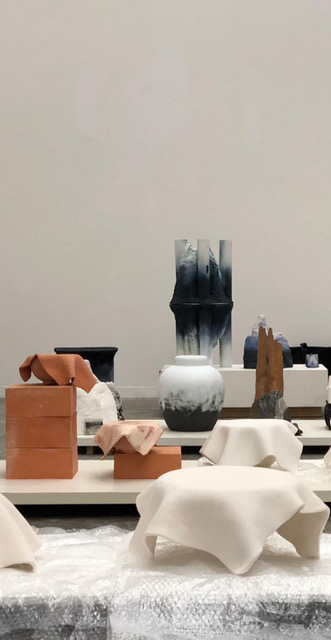 - In between, installation en céramique, barrières, socles, drapé, pot. Vue de l’exposition collective, Bridges made out of rocks, Seoul Museum of Art, SEMA Nanji exhibition hall, 2014 Credit photo : Marion Bocquet-Appel