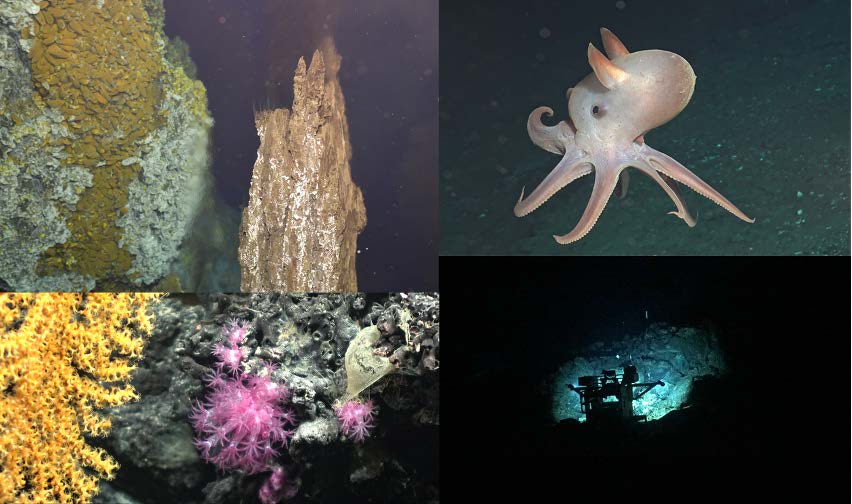 - Images sélectionnées du champ hydrothermal Lucky Strike. La structure active Tour Eiffel, le poulpe à oreille Grimpoteuthis, des coraux en périphérie des sources actives et le fond éclairé par les lumières de la caméra SMOOVE sur le module d’observation écologique TEMPO de l’observatoire EMSO-Açores.